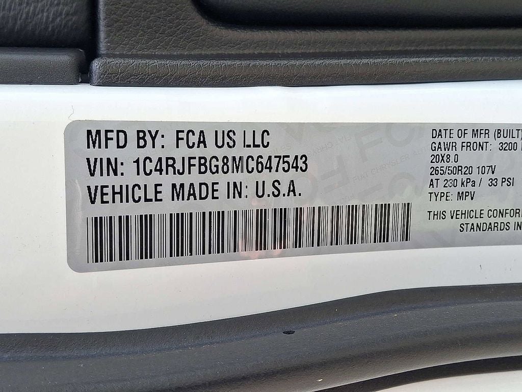 4WD, 1-Year SiriusXM Guardian Trial, 230MM Rear Axle, 3.45 Rear Axle Ratio, 4-Wheel Disc Brakes, 4G LTE Wi-Fi Hot Spot, 506 Watt Amplifier, 6 Speakers, 8.4 Touchscreen Display, 80th Anniversary Luxury Group, ABS brakes, Active Noise Control System, Adaptive Cruise Control w/Stop, Advanced Brake Assist, Air Conditioning, Alloy wheels, AM/FM radio: SiriusXM, Anti-whiplash front head restraints, Apple CarPlay, Apple CarPlay/Android Auto, Audio memory, Auto-dimming door mirrors, Auto-dimming Rear-View mirror, Automatic temperature control, Berber Floor Mats w/80th Anniversary Tag, Black Roof Molding, Body Color Claddings, Body Color Door Handles, Body Color Shark Fin Antenna, Brake assist, Bumpers: body-color, Cargo Compartment Cover, Compass, Dark Day Light Opening Moldings, Dark Headlamp Bezel Finish, Dark Lens Taillamps, Delay-off headlights, Driver door bin, Driver vanity mirror, Dual front impact airbags, Dual front side impact airbags, Dual-Pane Panoramic Sunroof, Electronic Stability Control, Emergency communication system: SiriusXM Guardian, Four wheel independent suspension, Front Accent/Body Color Fascia, Front anti-roll bar, Front Bucket Seats, Front Center Armrest w/Storage, Front dual zone A/C, Front fog lights, Front License Plate Bracket, Front reading lights, Full Speed FWD Collision Warn Plus, Fully automatic headlights, Garage door transmitter, Google Android Auto, GPS Antenna Input, GPS Navigation, Granite Crystal Exterior Accents, Granite Crystal Exterior Badging, Granite Crystal Exterior Mirror Caps, Granite Crystal/Black Grille, HD Radio, Heated door mirrors, Heated front seats, Heated Second Row Seats, Heated steering wheel, Illuminated entry, Integrated Voice Command w/Bluetooth®, Jeep 80th Anniversary Badges, Jeep 80th Anniversary Edition, Knee airbag, Lane Departure Warning Plus, Leather Shift Knob, Leather Trimmed Bucket Seats, Leather Trimmed Bucket Seats (JY), Low tire pressure warning, LT. Tungsten Interior Accent Stitching, Memory seat, Navigation System, Normal Duty Suspension, Occupant sensing airbag, Outside temperature display, Overhead airbag, Overhead console, Panic alarm, Parallel & Perp Park Assist w/Stop, ParkView Rear Back-Up Camera, Passenger door bin, Passenger vanity mirror, Piano Black/Anod. Gunmetal Interior Accents, Power door mirrors, Power driver seat, Power Liftgate, Power moonroof, Power passenger seat, Power steering, Power Tilt/Telescope Steering Column, Power windows, Premium Alpine Speaker System, Quick Order Package 2BK 80th, Radio data system, Radio: Uconnect 4C Nav w/8.4 Display, Rain Sensitive Windshield Wipers, Rear Accent/Body Color Fascia, Rear anti-roll bar, Rear reading lights, Rear seat center armrest, Rear window defroster, Rear window wiper, Remote keyless entry, Roof rack: rails only, Security system, SiriusXM Satellite Radio, SiriusXM Traffic Plus, SiriusXM Travel Link, Speed control, Speed-sensing steering, Speed-Sensitive Wipers, Split folding rear seat, Spoiler, Steering wheel mounted audio controls, Tachometer, Telescoping steering wheel, Tilt steering wheel, Traction control, Trip computer, Turn signal indicator mirrors, Variably intermittent wipers, Ventilated Front Seats, Voltmeter, Wheels: 18 x 8.0 Tech Gray Diamond Cut, Wheels: 20 x 8.0 Granite Crystal Aluminum, 4WD.