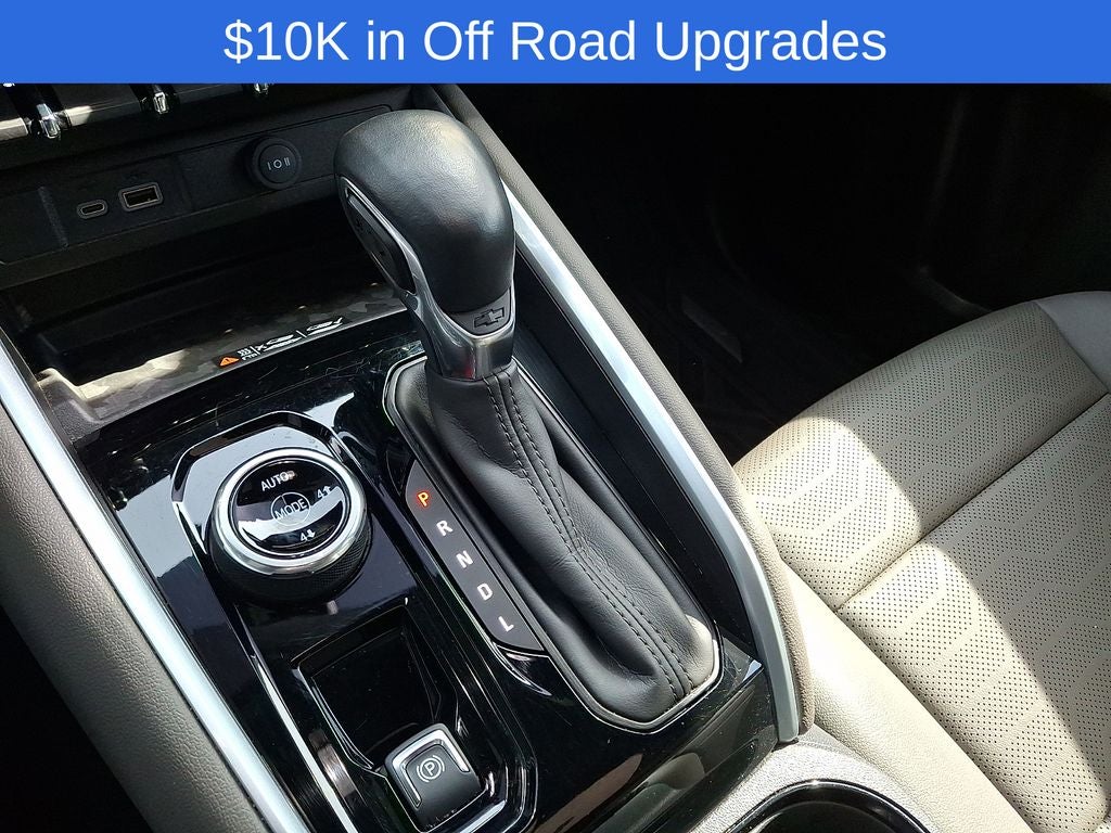 4WD, 1st & 2nd Row All-Weather Floor Liner (LPO), 3.42 Rear Axle Ratio, 4-Way Manual Passenger Seat Adjuster, 4-Wheel Disc Brakes, 6 Speakers, 6-Speaker Audio System Feature, 8-Way Power Driver Seat Adjuster, ABS brakes, Adaptive Cruise Control, Air Conditioning, Alloy wheels, AM/FM radio: SiriusXM, Apple CarPlay/Android Auto, Auto High-beam Headlights, Auto-dimming Rear-View mirror, Automatic Emergency Braking, Automatic temperature control, Blind Zone Steering Assist, Bose Premium 7-Speaker Audio System Feature, Brake assist, Chevy Safety Assist, Cloth/Evotex Seat Trim, Compass, Delay-off headlights, Driver & Front Passenger Ventilated Seats, Driver door bin, Driver Memory Settings, Driver Seatback Map Pocket, Driver vanity mirror, Dual front impact airbags, Dual front side impact airbags, Electronic Automatic Cruise Control, Electronic Stability Control, Following Distance Indicator, Forward Collision Alert, Front anti-roll bar, Front Bucket Seats, Front Center Armrest, Front dual zone A/C, Front fog lights, Front License Plate Kit, Front Pedestrian & Bicyclist Braking, Front reading lights, Front wheel independent suspension, HD Surround Vision, Heated door mirrors, Heated Driver & Front Passenger Seats, Heated front seats, Heated Steering Wheel, Illuminated entry, IntelliBeam Automatic High Beam On/Off, Lane Keep Assist w/Lane Departure Warning, Low tire pressure warning, Navigation System, Occupant sensing airbag, Outside temperature display, Overhead airbag, Overhead console, Panic alarm, Passenger door bin, Passenger Seatback Map Pocket, Passenger vanity mirror, Perforated Leather-Appointed Seat Trim, Power door mirrors, Power Driver Lumbar Control Seat Adjuster, Power driver seat, Power Sliding Glass w/Manual Shade Sunroof, Power steering, Power windows, Preferred Equipment Group 4ZR, Radio data system, Radio: 11.3 Diagonal Advanced Color LCD Display, Rear Center Armrest, Rear Cross Traffic Braking, Rear Park Assist, Rear Pedestrian Alert, Rear reading lights, Rear step bumper, Rear window defroster, Rear-Window Electric Defogger, Remote keyless entry, Removable Front Off-Road Assist Steps (LPO), Safety Package, Security system, SiriusXM Radio, Speed control, Speed-sensing steering, Split folding rear seat, Steer