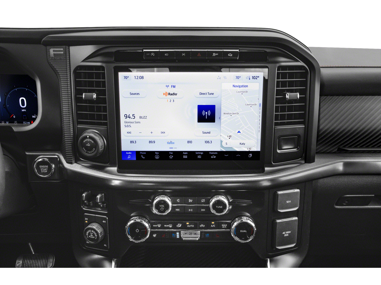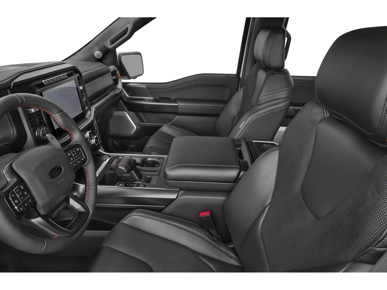 Inside, the Raptor's cabin is a sanctuary of refined comfort and cutting-edge technology. Indulge in the premium Alcantara Suede & Leather RECARO Front Seats, which provide exceptional support and comfort for long journeys. The intuitive SYNC 4 infotainment system with Connected Navigation keeps you connected and entertained, while the Heads-Up Display and 14-speaker B&O Unleashed Sound System elevate the driving experience.